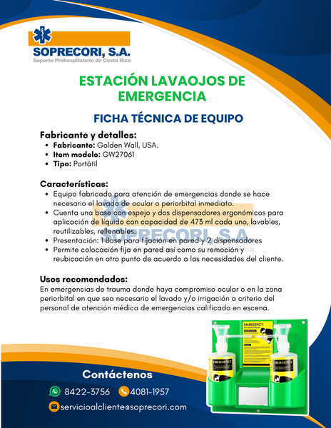 EL KIT QUE EL CLIENTE ADQUIERE INCLUYE: x1 Base para Estación, x2 dispensadores ergonómicos para lavado ocular de emergencia y x2 bolsas de solución fisiológica de 500 ml cada una para colocar en los dispensadores.