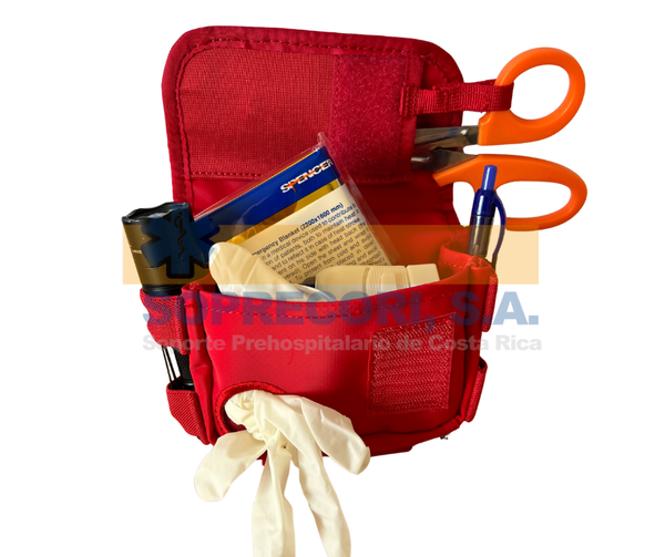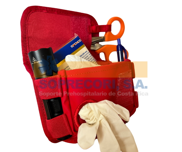 - Las fundas exteriores elásticas en la parte superior, los costados y el frente permiten asegurar diversos equipos tales como focos pupilares, radios, barras de luz, spray de protección, cuchillos de rescate, torniquetes, tijeras multiuso, entre otros accesorios según lo requiera el rescatista.